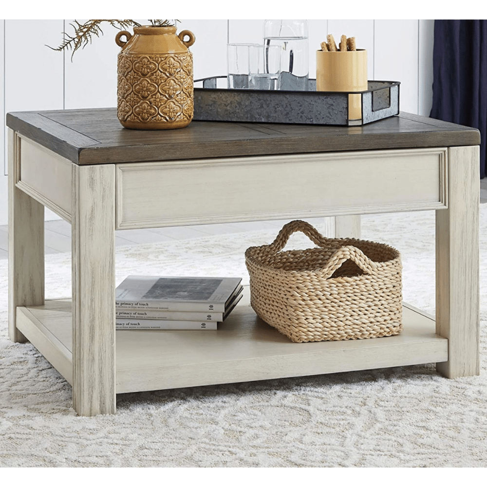 This beautiful piece features a plank-effect top and textured two-tone finish, giving it a timeless look that will never go out of style. Made of veneer, wood and engineered wood, it also features a spring-lift top design, perfect for impromptu work sessions. The spacious lower shelf lends dimension to the design, making it a truly standout piece. And the unique two-tone finish is created by combining Oak and Acacia wood, mixing a trendy textured antique white color base with a textural weathered oak finish top. So if you're searching for a coffee table that's both stylish and functional, this one is the perfect choice.