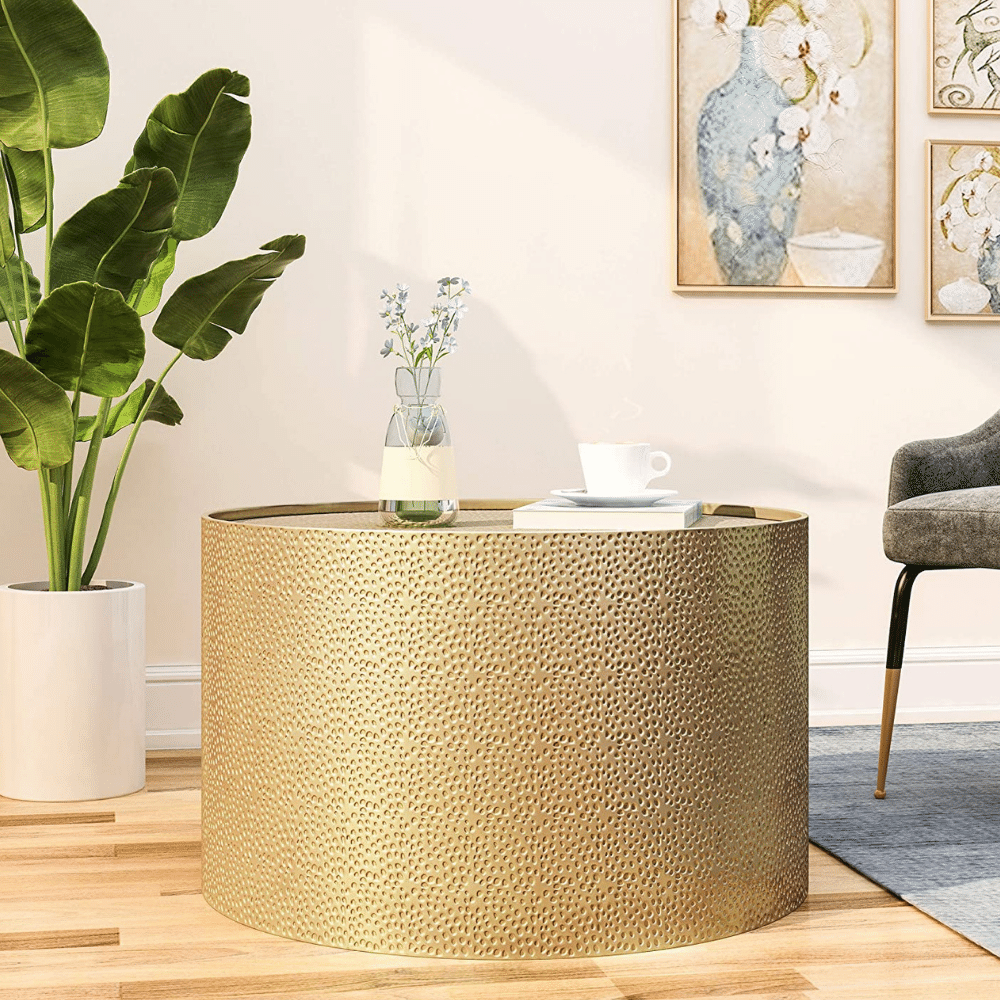 This coffee table features a clean, cylindrical shape and convenient table lip, perfect for resting your drinks or snacks on. The unique hammered surface adds a beautiful textured look to your space. The sturdy construction of this iron frame ensures that this table will hold up under heavy use. Add this table set to your home today and enjoy the chic atmosphere it will instantly create.