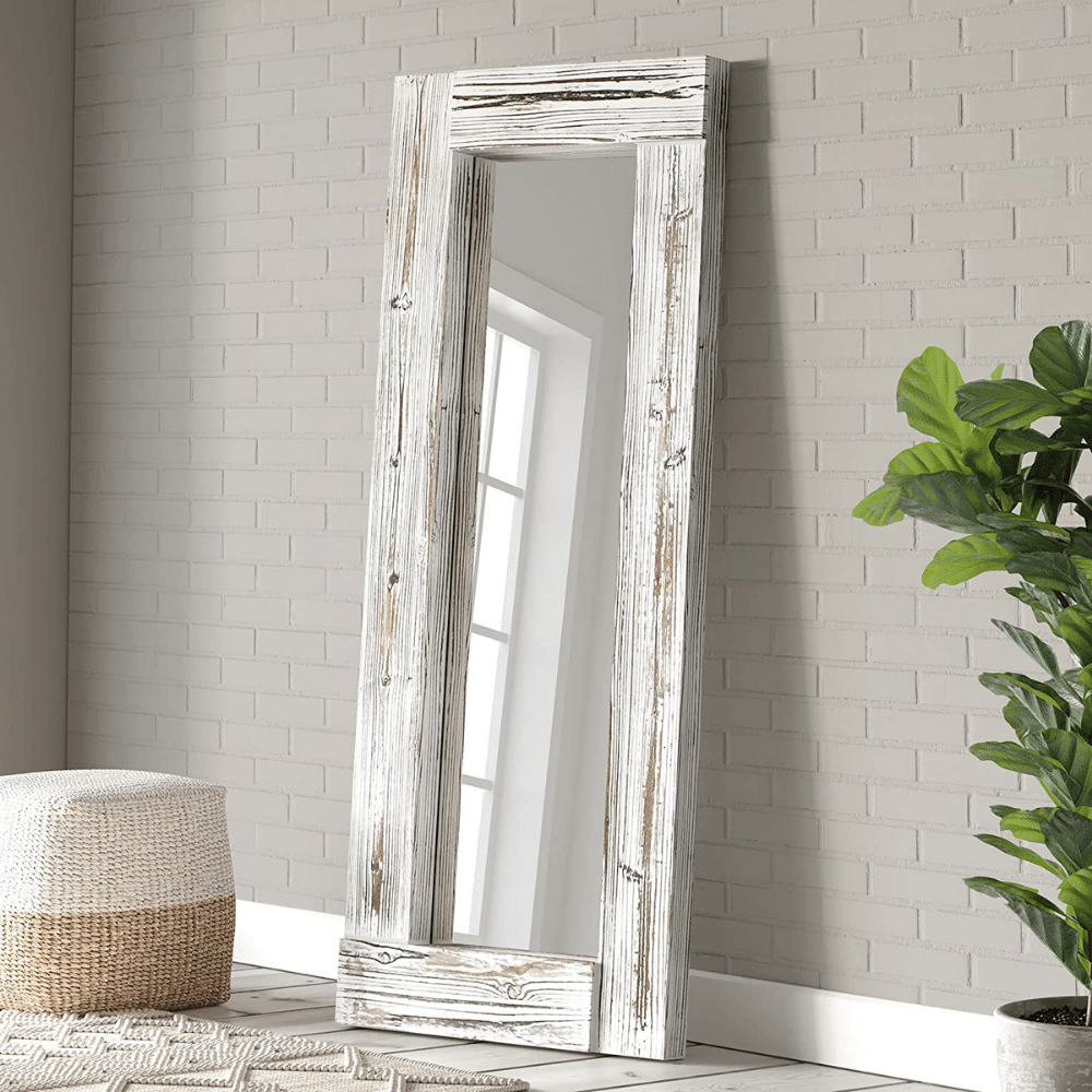 This large mirror has a beautiful rustic wood frame that will give any room a touch of farmhouse flair. The wood border on this gently distressed mirror gives it a reclaimed barnwood feel that is sure to impress guests. You can set this leaning mirror against the wall or use it in any room to create the illusion of more space. Whether you’re looking for a focal point for your living room or a unique addition to your bedroom décor, the Barnyard Designs Oversized Floor Length Mirror is the perfect choice.
